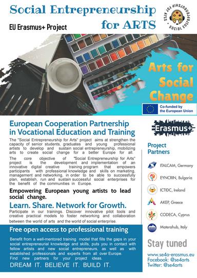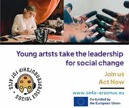 The overarching aim of the SE4A (Social Entrepreneurship for Arts) project is to strengthen the capacity of young professional artists and graduates in arts and humanities to develop and sustain social enterprises, mobilizing arts to create social change for a better Europe for all.